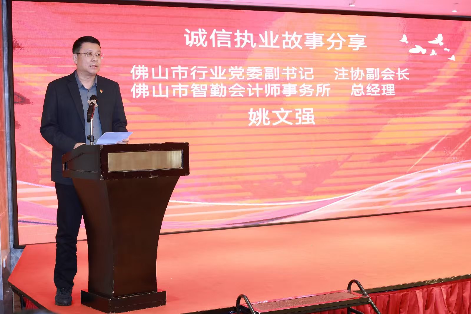 为全面总结2025年度佛山市注册会计师与资产评估行业工作,纪念注册会计师制度恢复重建45周年,深入推进诚信建设,增强行业从业人员的职业荣誉感与使命感,营造诚信执业的良好氛围,佛山市注册会计师协会与佛山市资产评估协会于12月23日下午联合召开行业会员代表大会暨诚信建设月活动。全市220余名行业代表参会,佛山市财政局党组成员、副局长、行业党委书记雷绍铭,佛山市财政局四级调研员、行业党委副书记、市注协会长肖锋,市财政局四级调研员、会计科科长杨志勇,市财政局绩效科科长、市评协会长李洁仪,市财政局监督检查科科长魏茂芳等领导出席会议。